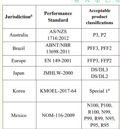 CDC優化呼吸器供應策略中推薦的NIOSH替代標準,除了中國標準:GB 2626-2006外,其他均被EUA采納。