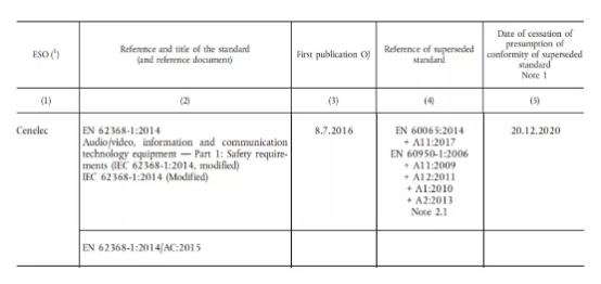 依據(jù)歐盟CE標志對于“置于市場”的時間認定,只要產(chǎn)品進入銷售之時就必須符合法規(guī),說明產(chǎn)品在2020年12月20日起將無法以EN 60950-1與EN 60065標準進入歐盟市場。