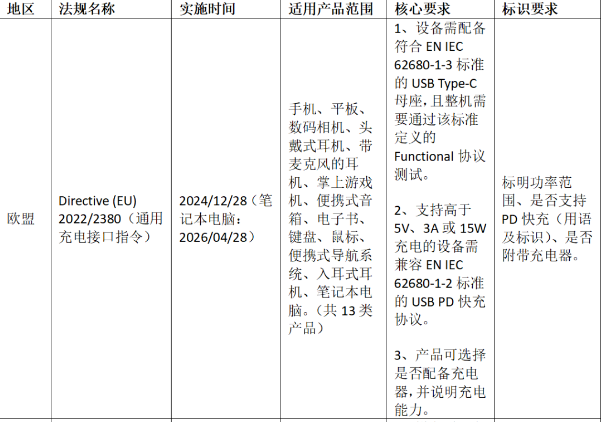 沙特阿拉伯、美國加州、印度等國家和地區也已出臺相關法律法規,明確實施時間和要求。各國對Type-C充電器的法規要求整理如下: