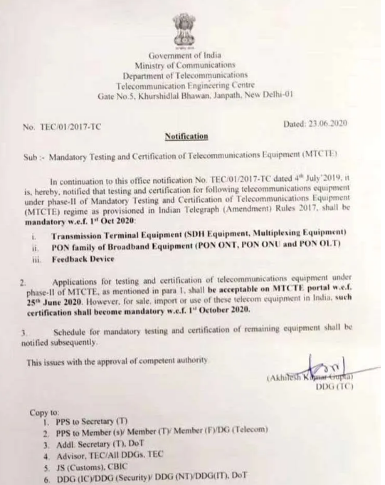 20206月中旬,印度電信工程中心(TEC)再次修訂了有關電信設備強制性測試和認證(MTCTE)程序,此次修訂放松了MTCTE程序中認證產(chǎn)品標簽的要求。根據(jù)公告內(nèi)容,加貼標簽的強制要求可以延期至202141日,即從2020101日算起,過渡期6個月。