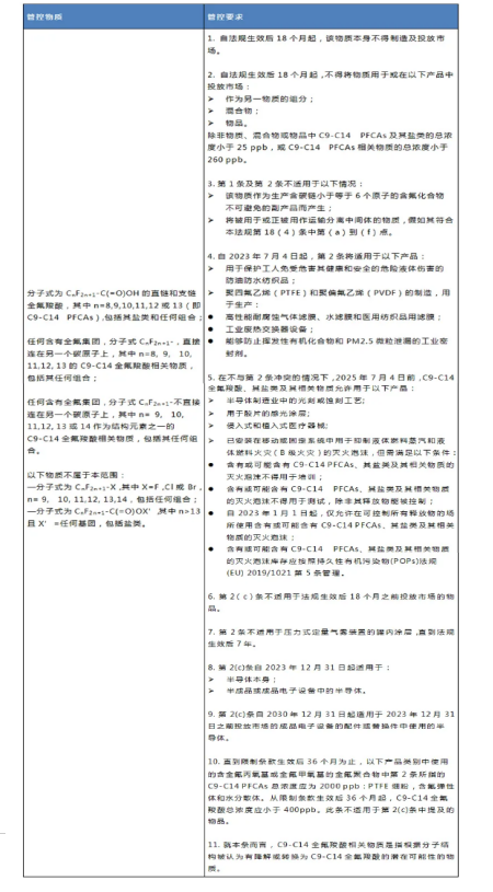 2020年8月3日,歐盟向WTO提交通報(bào) G/ TBT/ N/EU/ 731,擬在歐盟REACH法規(guī)((EC) No 1907/2006)附錄XVII中限制C9-C14 PFCAs。該法規(guī)草案正接受公眾咨詢,咨詢期為通報(bào)發(fā)出后60天。該法規(guī)預(yù)計(jì)于2021年一季度被采納,在歐盟官方公報(bào)上發(fā)布20天后生效。相關(guān)限制要求于法規(guī)生效18個(gè)月后實(shí)施。