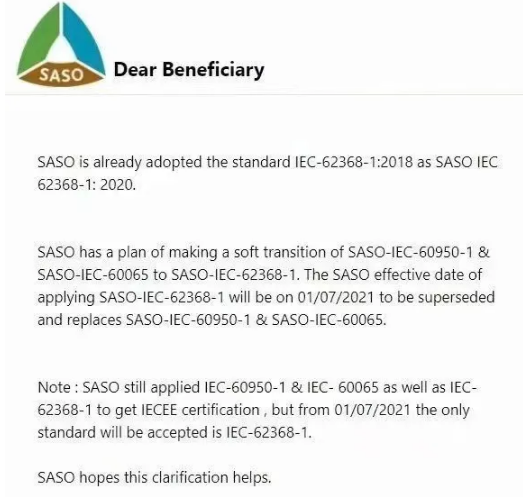 近期,沙特阿拉伯標準化組織(SASO)已宣布采用新的SASO-IEC 62368-1:2020(IEC 62368-1:2018 3.0版)標準。自2021年7月1日起,對于音頻/視頻、信息和通信技術設備,沙特SASO將僅接受SASO-IEC 62368-1:2020用于申請SASO IECEE(SIRC)證書和SABER合格機構認證(CoC),不再接受基于SASO-IEC 60950-1和SASO-IEC 60065標準的申請。