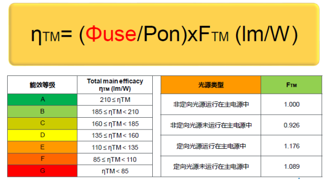 2.標簽能效等級計算:?TM = (Φuse / Pon) X FTM 單位:(lm/W)。