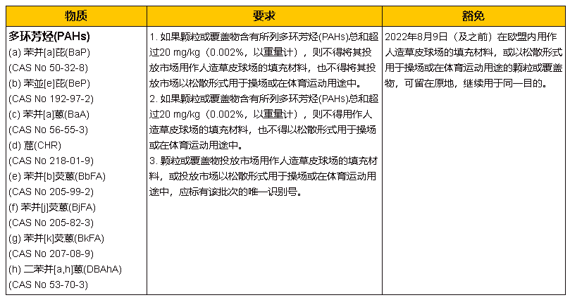 2021年7月21日,歐盟委員會發(fā)布了法規(guī)(EU) 2021/1199,修訂REACH法規(guī)(EC) No 1907/2006附錄XVII第50項,新增限制用作人造草皮球場的填充材料、以松散形式用于操場或在體育運動用途中的顆粒和覆蓋物中8種多環(huán)芳烴(PAHs)的含量。該修訂將于2021年8月10日生效,并將從2022年8月10日起實施。 以下為修訂的詳細內(nèi)容:
