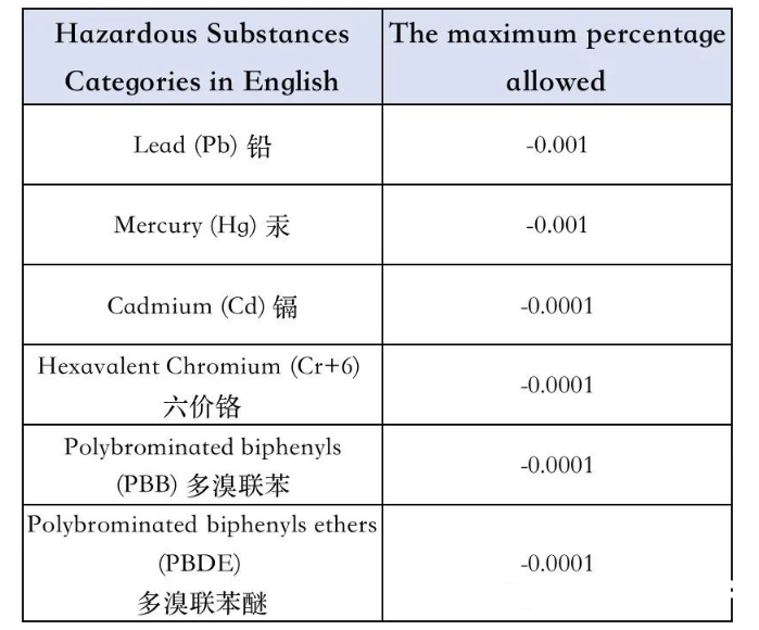 沙特RoHS法規(guī)管控,種有害物質(zhì),其限值等同于歐盟RoHS指令中的限值: