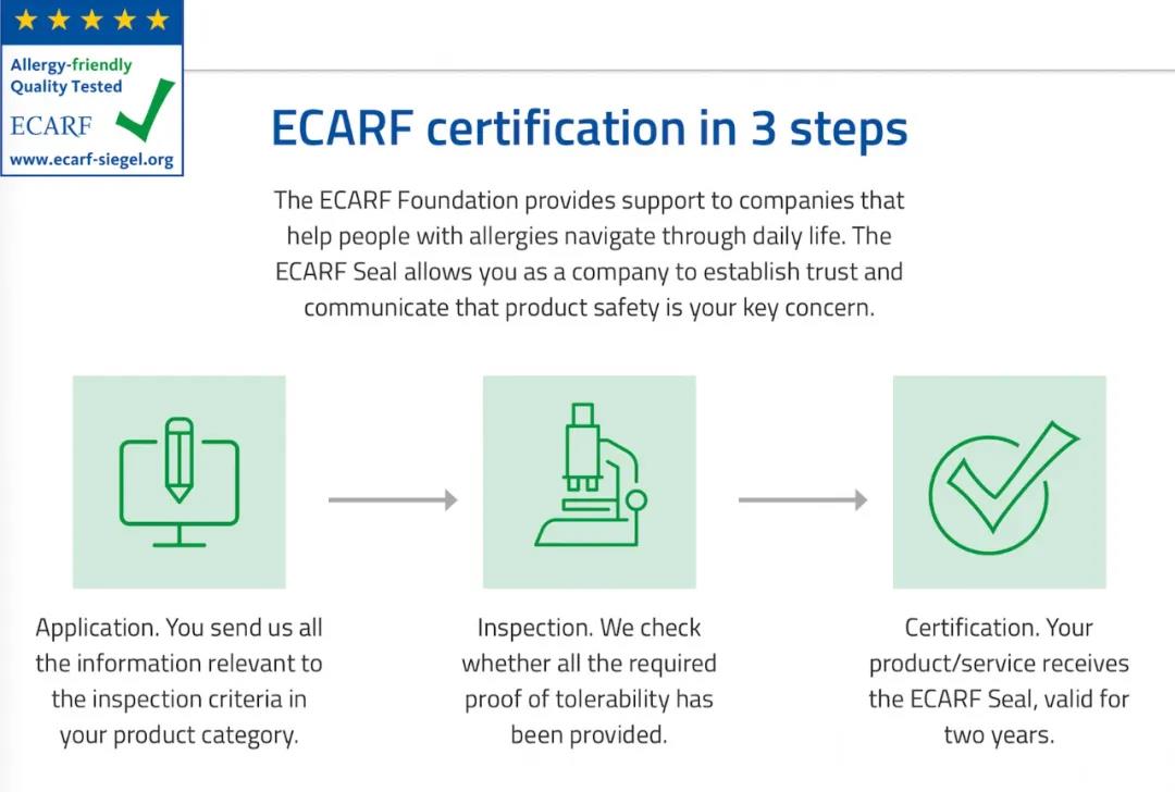 頒發(fā)的ECARF質(zhì)量標志的防過敏產(chǎn)品,需符合嚴格的檢測標準。為了獲得認證,制造商必須披露所有的原材料和配方。