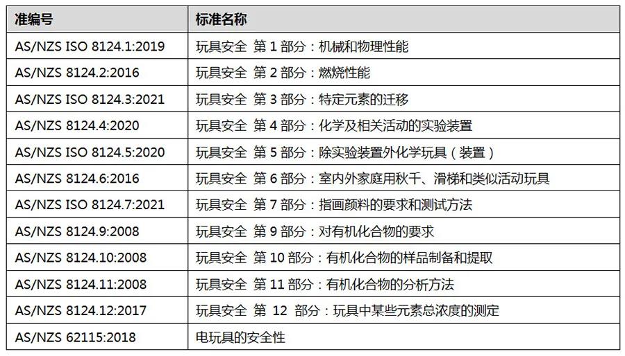在玩具的自愿性標(biāo)準(zhǔn)方面,澳大利亞基本上采用國(guó)際標(biāo)準(zhǔn)ISO 8124系列標(biāo)準(zhǔn),歐盟EN71系類標(biāo)準(zhǔn)。主要標(biāo)準(zhǔn)如下表所示: